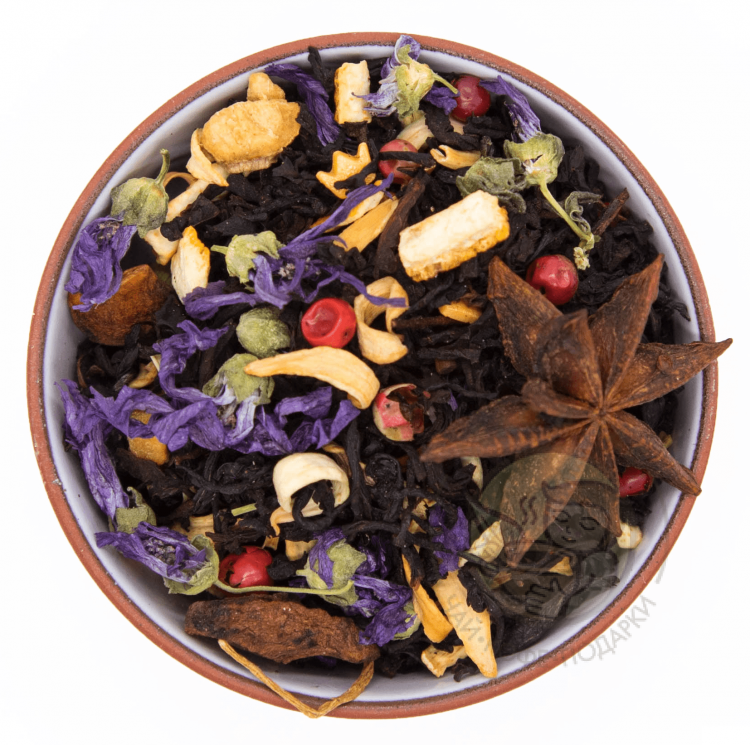 Чай индийский, розовый перец горошек, цедра апельсина, корень имбиря, бадьян, цвет мальвы, цветки апельсинового дерева, посыпки короны, ароматизатор